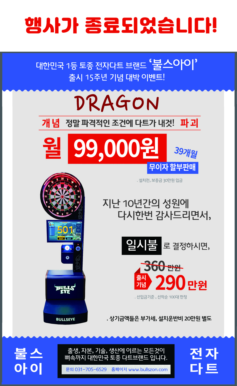 * 드래곤은 지폐투입기 대신 다트보관함이 기본으로 장착되어 있습니다.